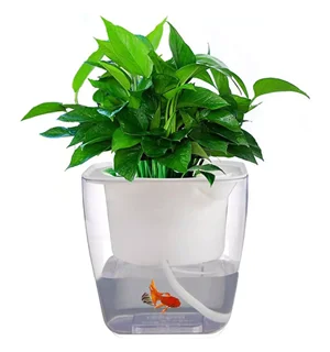 محفظه ی پایینی اش را می توانید به عنوان آکواریوم برای نگهداری از ماهی نیز استفاده کنید که هم ماهی درون آن زندگی کند و هم آب داخلش برای گیاه داخل گلدان وجود داشته باشد. به دلیل شفاف بودن محفظه ی بیرون انداختن ماهی درونش محفظه و گلدان را زیباتر می کند.