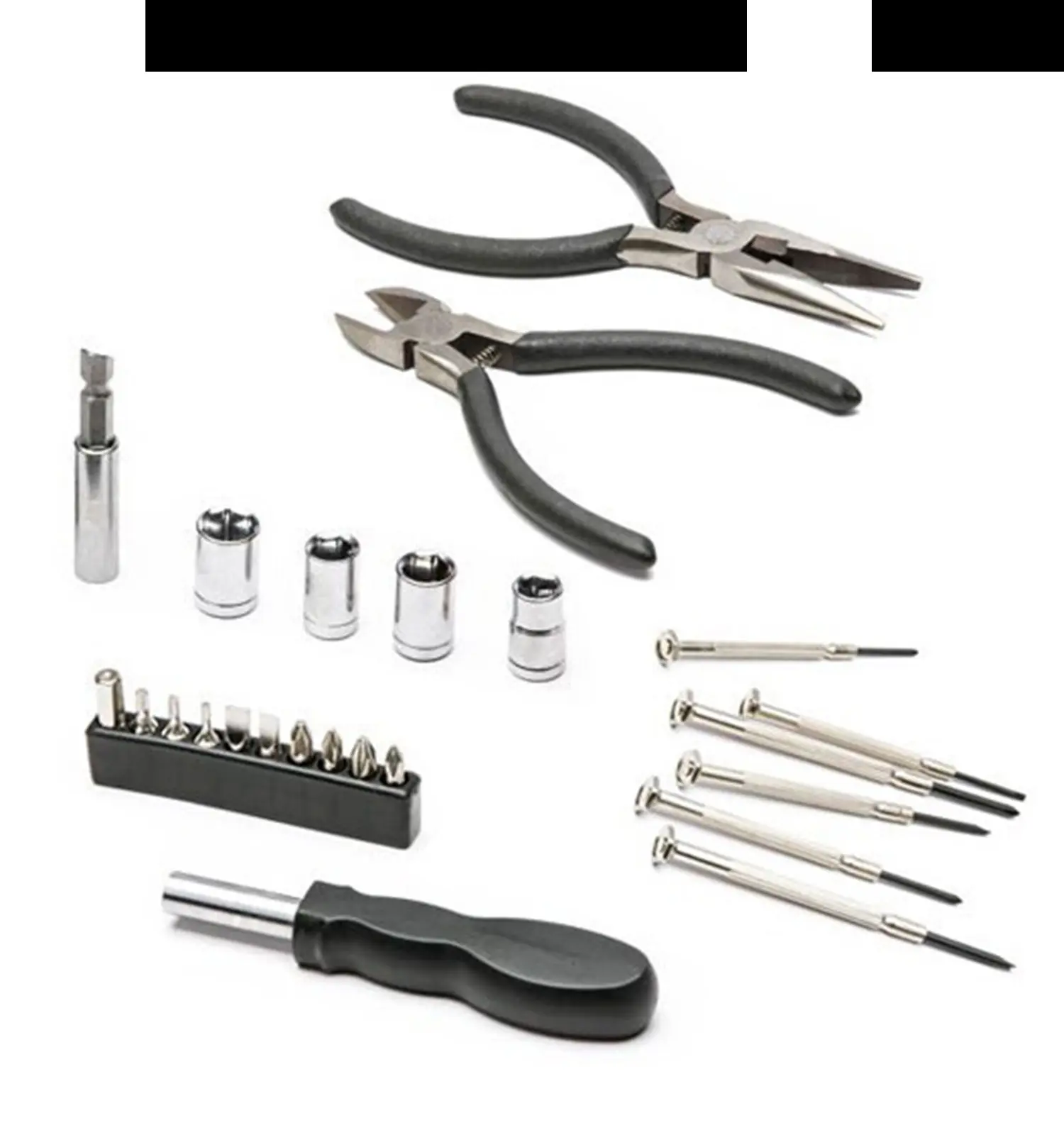 ۳ عدد پیچ گوشتی چهار سو، ۳ عدد پیچ گوشتی دو سو، آچار بکس، میله رابط آچار، دم باریک، سیم چین
