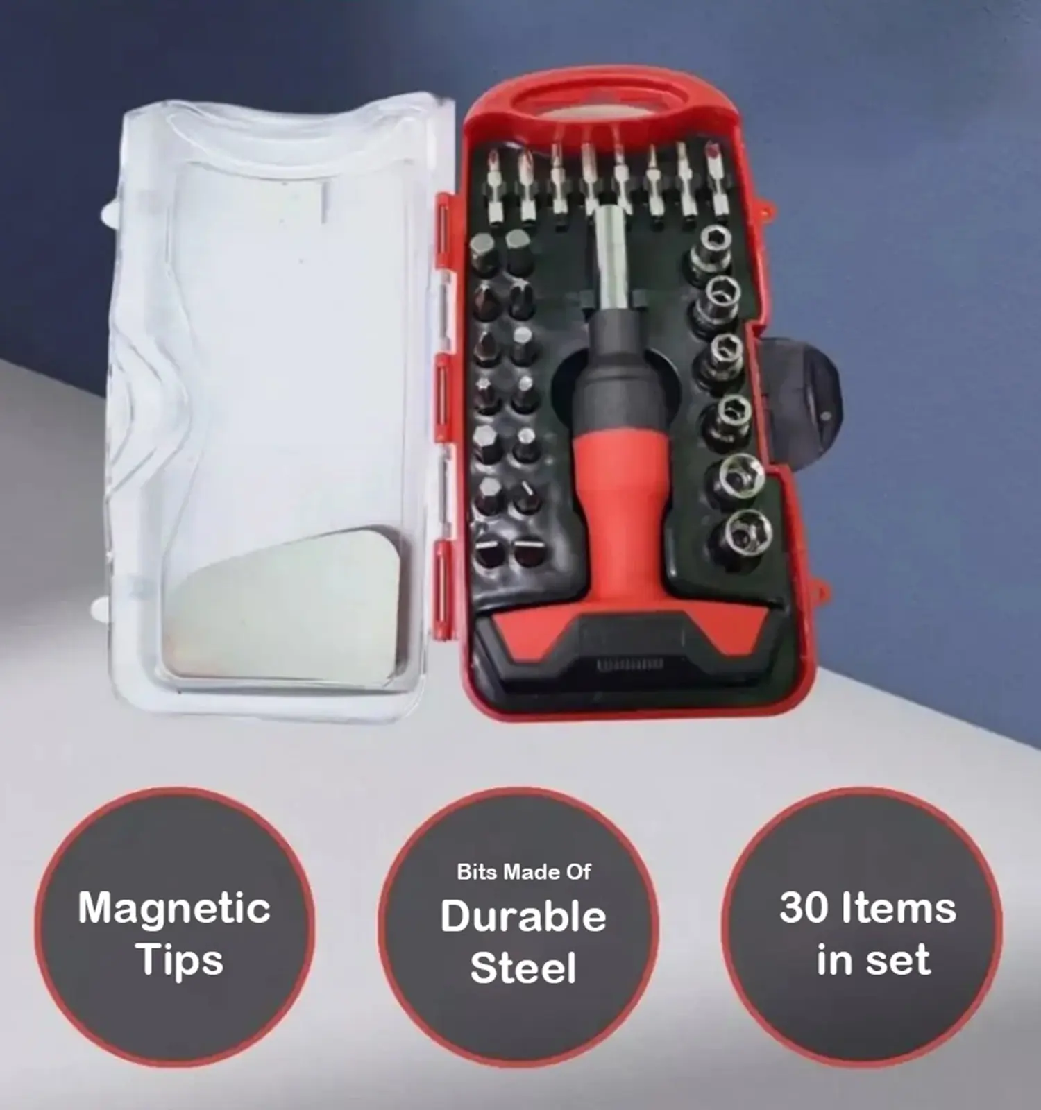 22 عدد سری شامل انواع آلن، انواع آچار خورشیدی یا ستاره ای، انواع پیچ گوشتی، انواع چهار سو، و یک دسته بلند